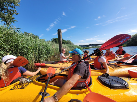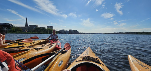 Mit Kajaks und guter Laune ausgestattet, paddelten wir gemütlich durch den Stadthafen. Dabei erfuhren wir Interessantes zur Geschichte Rostocks und unter anderem über versunkene Burgen – einem wenig bekannten, aber spannenden Kapitel der Stadtgeschichte. Das warme Wasser und die entspannte Atmosphäre machten die Tour zu einem besonderen Erlebnis.